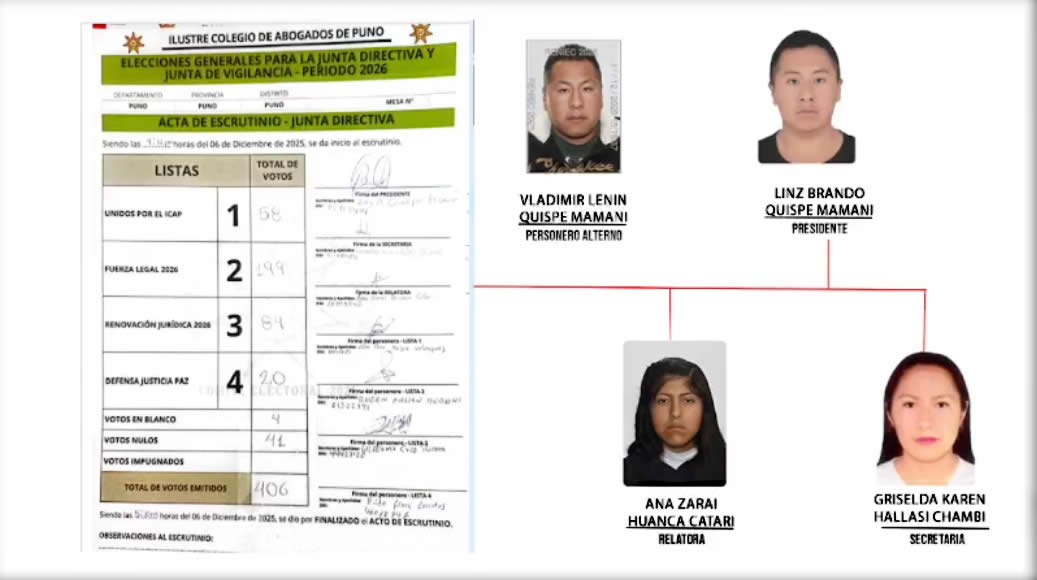 Los miembros de mesa fueron identificados como Lins Quispe Mamani, como presidente, Griselda Karen Hallasi Chambi como secretaria y Ana Zarai Huanca Catari, como relatora.