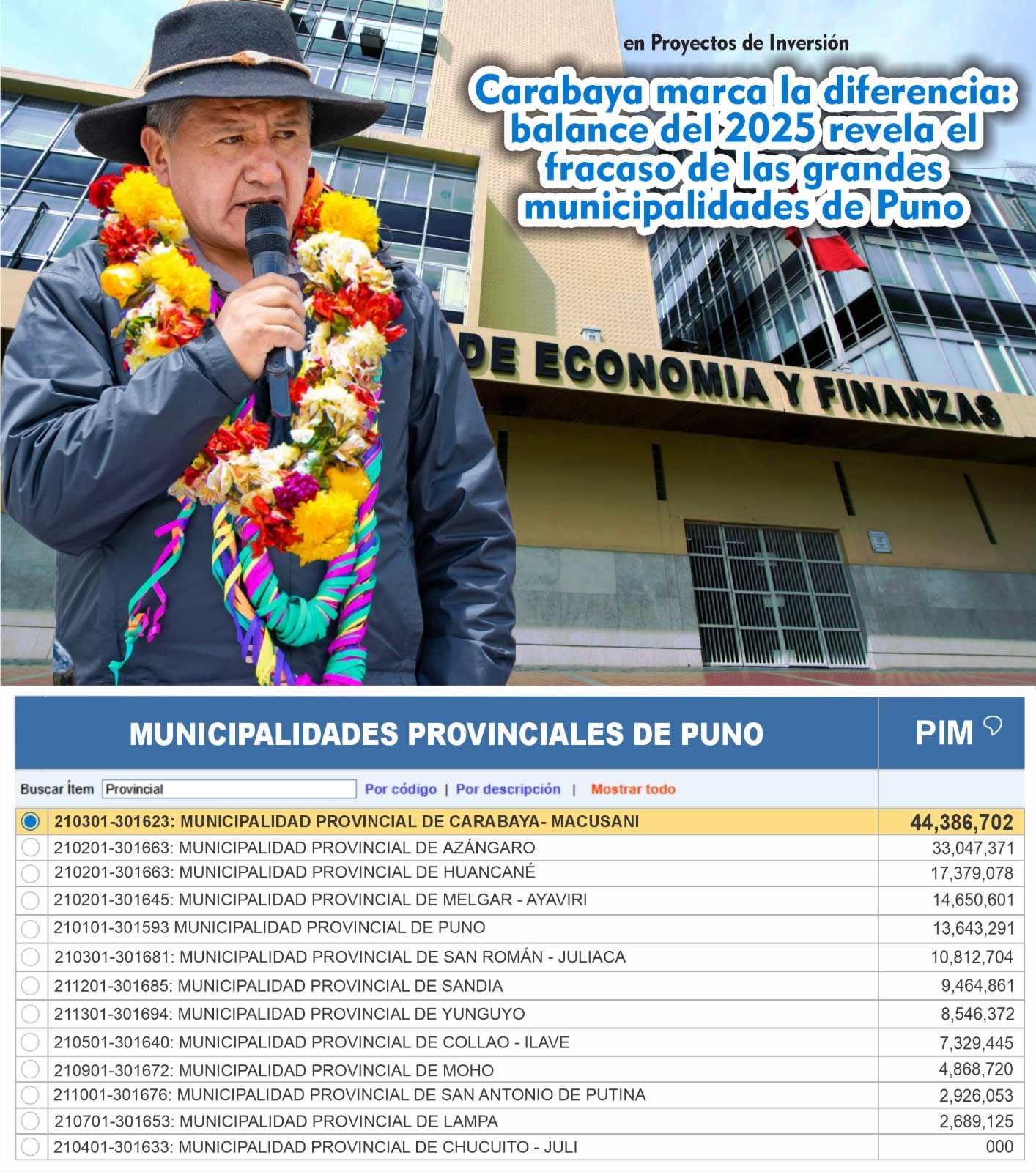 La Municipalidad Provincial de Carabaya–Macusani se ha convertido en la entidad local con mayor nivel de inversión pública en toda la región Puno en el 2025, superando ampliamente a municipios como San Román–Juliaca, Puno y otros, según el balance de gestión al cierre del año fiscal 2025.
