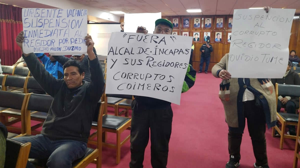 El Concejo inició a las 16:00 horas de este último 11 de diciembre en medio de protestas de dirigentes que exigían la suspensión del concejal, y la asistencia de ocho regidores, uno que llegó tarde y tres ausentes, que accionaron las críticas de los asistentes.
