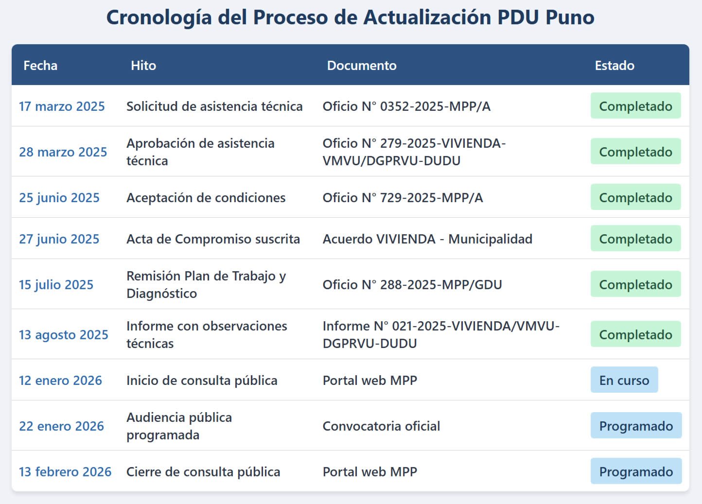 El Informe Técnico N° 021-2025-VIVIENDA/VMVU-DGPRVU-DUDU constituye el único pronunciamiento oficial emitido hasta la fecha; no existen evaluaciones posteriores debido a ausencia de documentos subsanatorios por parte del equipo técnico responsable de la planificación urbana puneña.