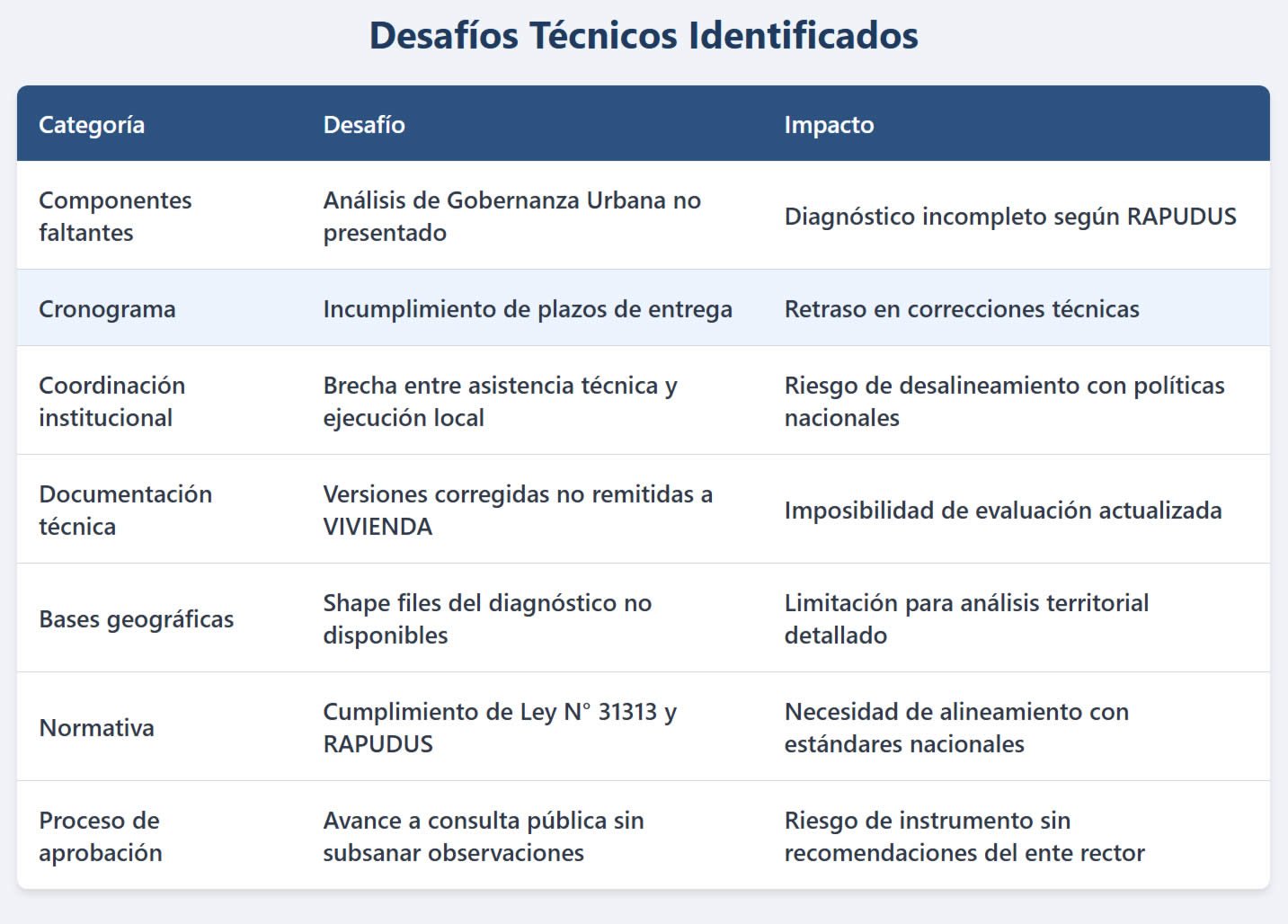 El Plan de Trabajo y Diagnóstico fue remitido el 15 de julio de 2025 mediante Oficio N° 288-2025-MPP/GDU para evaluación; el informe técnico identificó componentes faltantes, incluyendo el Análisis de Gobernanza Urbana requerido por normativa vigente del sector construcción.