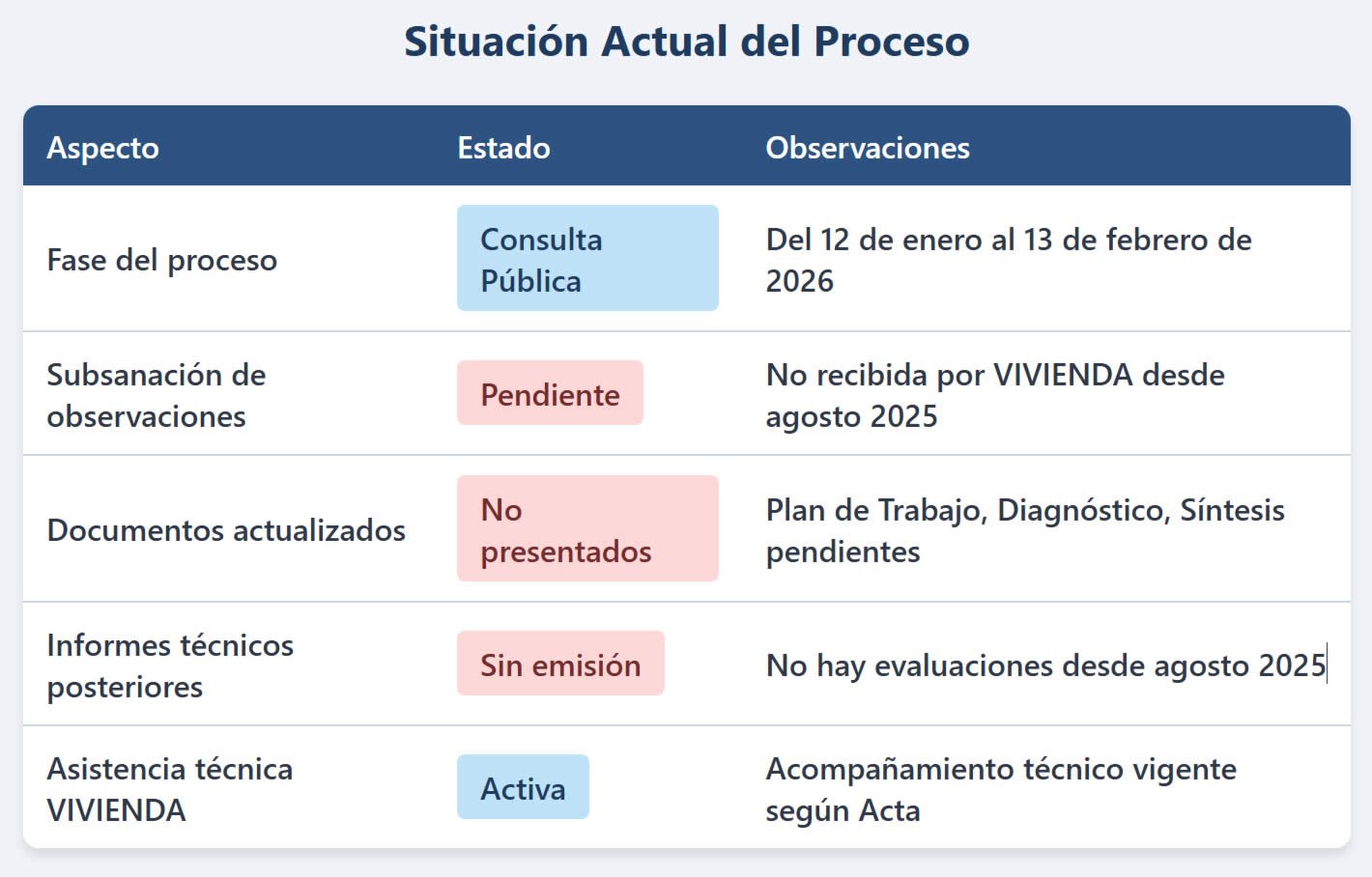 El arquitecto Manuel Gustavo Pimentel Higueras, responsable del informe técnico, señaló que «la DGPRVU no ha recibido, a la fecha, ningún documento que subsane las observaciones emitidas»; esta declaración oficial evidencia el estancamiento en la fase de corrección técnica del instrumento de planificación urbana territorial.